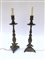 Coppia di porta ceri in bronzo con fusto tornito su base tripode, montati a luc