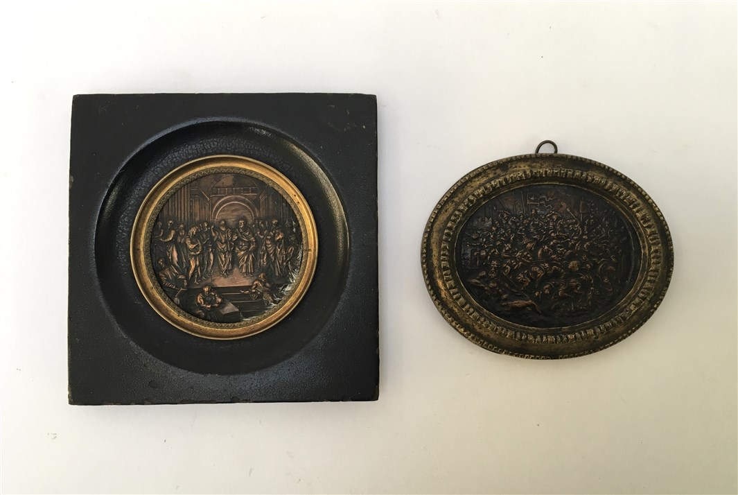 Lotto composto da un bassorilievo ovale in bronzo raffigurante una battaglia ed uno in tondo in rame raffigurante la ''Scuola di Atene''. Secolo XIX (cm 5,5x7 e d cm 6), in cornici (difetti)
