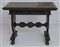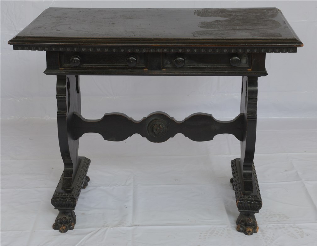 Tavolo scrittoio in legno ebanizzato, scolpito a motivi rinascimentali, con due cassettini sottopiano e piedi ferini (cm 102x79x61) (difetti)