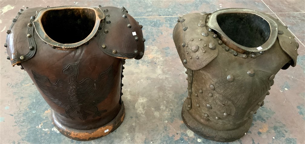 Cartone contenente due armature gettacarta coppia di busti portafiori con corazza in cuoi borchiato.