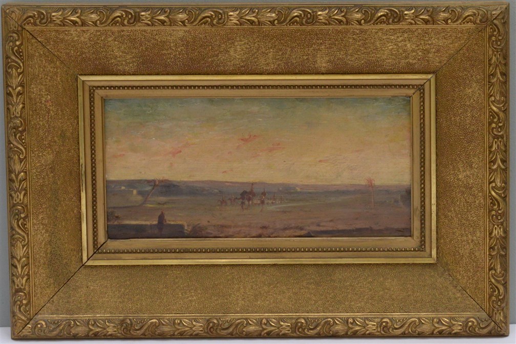 Artista orientalista del XIX Secolo "Paesaggio desertico" olio su tavola (cm 16x32,5) In cornice (lievi difetti)
