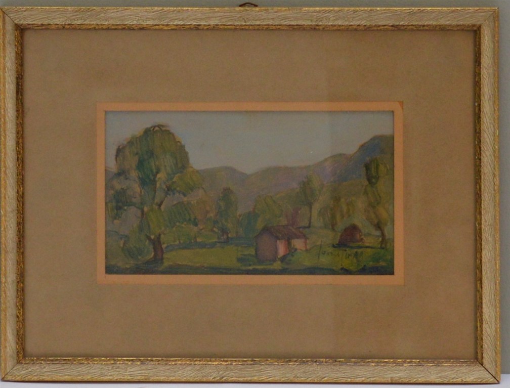 Firma indecifrata "Paesaggio montano" olio su cartone (cm 11,5x20) Firmato in basso a destra. In cornice (lievi difetti)