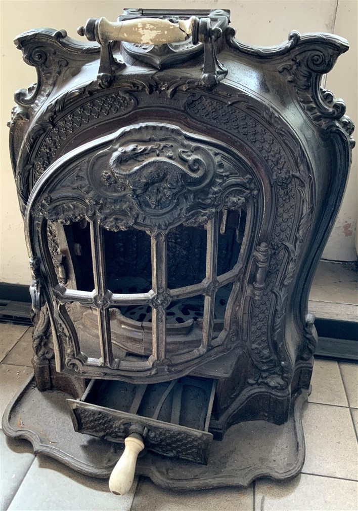 Stufa a caminetto in ghisa marcata E. Cabroche, modello La Salamandre. Francia fine secolo XIX, inizio XX (difetti)