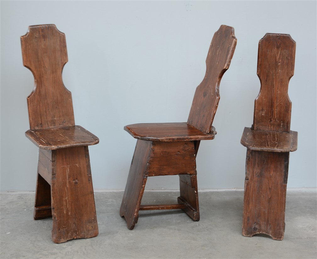 Gruppo di tre sgabellini rustici in legno di abete (difetti)