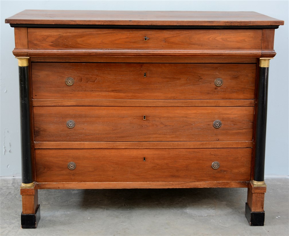 Cassettone impero in mogano a tre cassetti più uno sottopiano aggettante. Colonne laterali intere ebanizzate con capitelli in metallo dorato. Piedi a plinto (cm 142x116x69)(difetti)