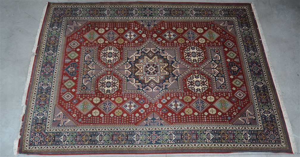 Decoro a medaglione su fondo rosso con motivi stilizzati nei toni del bianco, azzurro, rosso, blu e giallo (cm 332x246) (difetti)