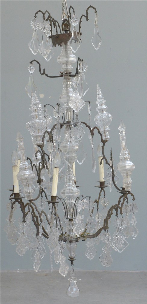 Lampadario a nove luci in metallo con fusto, pinnacoli e gocce in vetro (h cm 130)(difetti e mancanze)