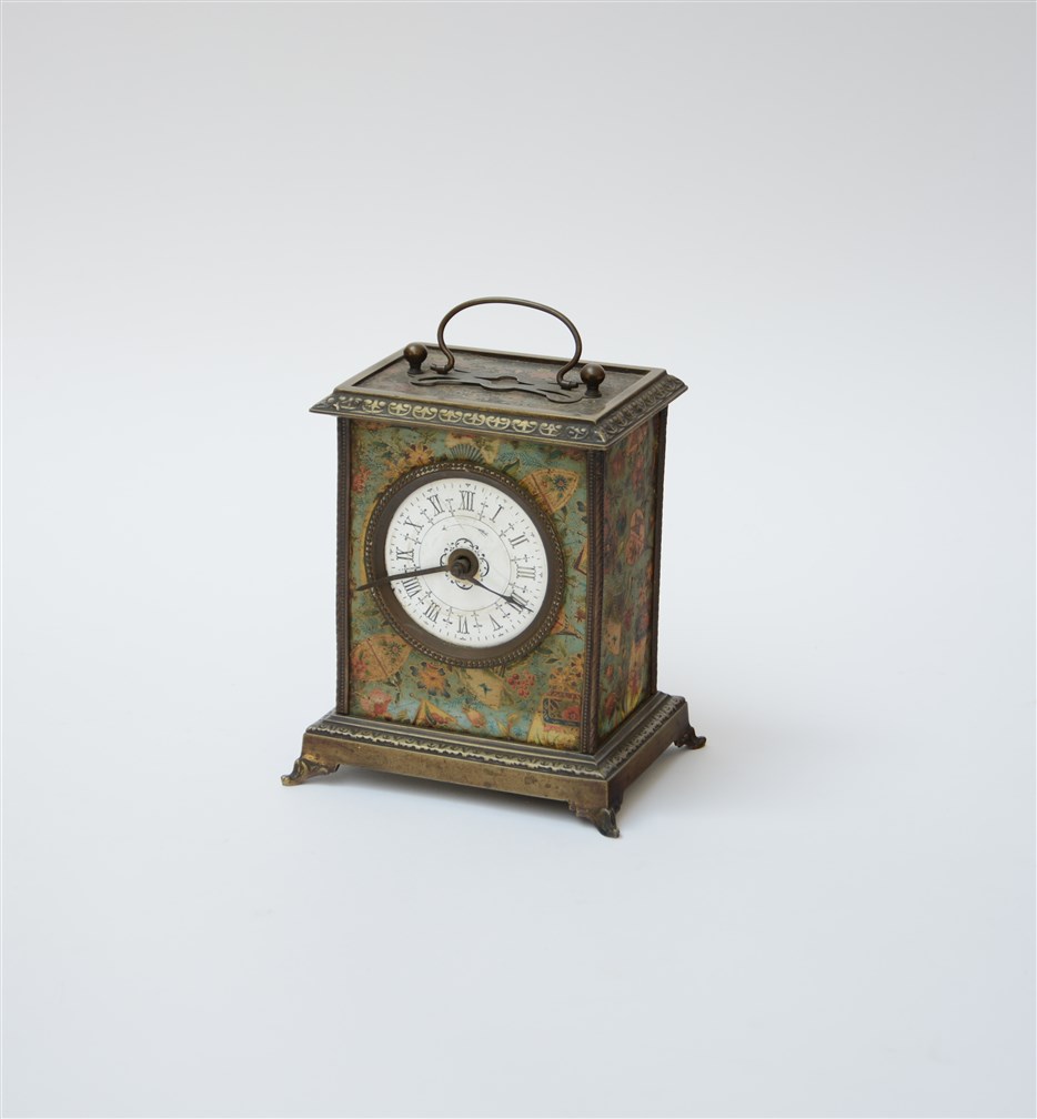 Orologio da tavolo con cassa in lacca e quadrante a cifre romane, movimento con carica manuale