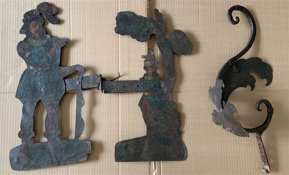Insegna in ferro a due sagome dipinte a figure unite a un supporto (difetti e mancanze)