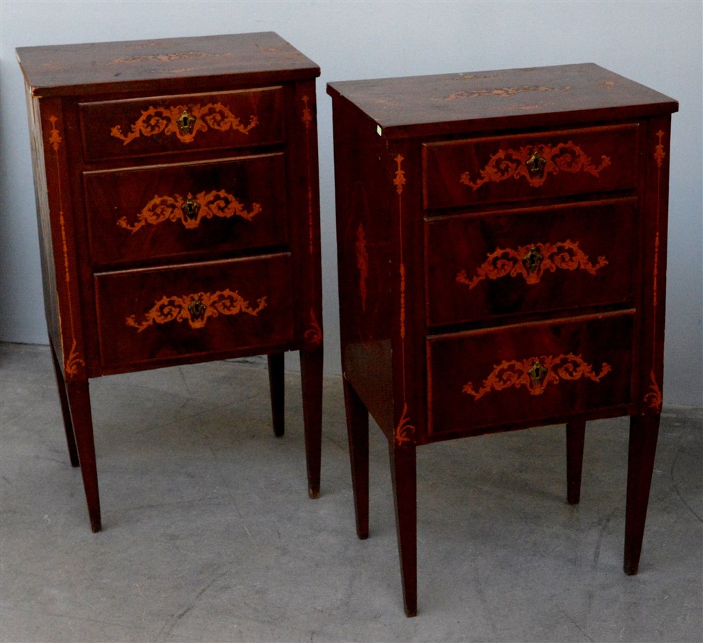 Coppia di comodini a tre cassetti interamnete filettati e intarsiati a motivi v
