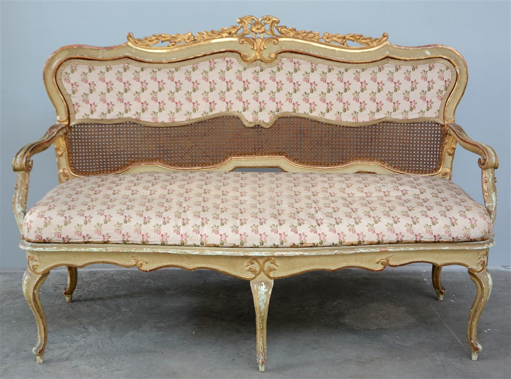 Antico divano di forma mossa in legno intagliato laccato e dorato (difetti e ma