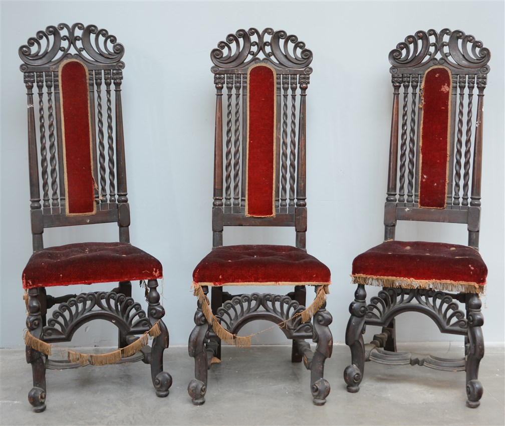Gruppo di tre sedie a schienale alto decorato con colonnine tornite e tortili. Gambe sagomate e intagliate, rivestite in velluto color porpora (due stampigliate ML sul retro)(difetti e mancanze)