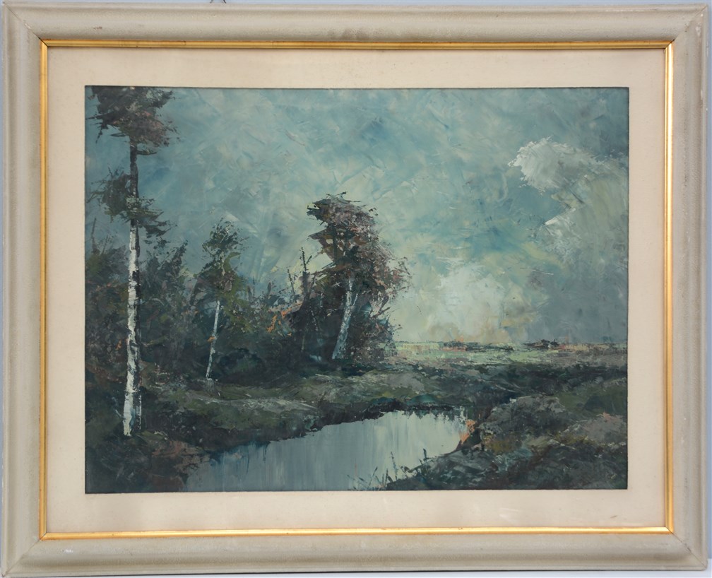 Lotto 1868 | Ignoto "Paesaggio con alberi e corso d'acqua" olio su masonite (cm 60x80) in co