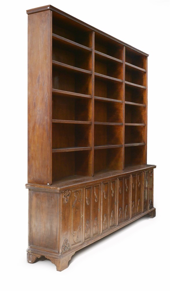 Libreria a due corpi con parte superiore a giorno e parte inferiore a sei ante riquadrate e pannelate (cm 275x265x44) (difetti)