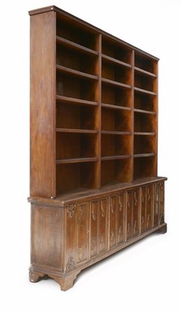 Libreria a due corpi con parte superiore a giorno e parte inferiore a sei ante