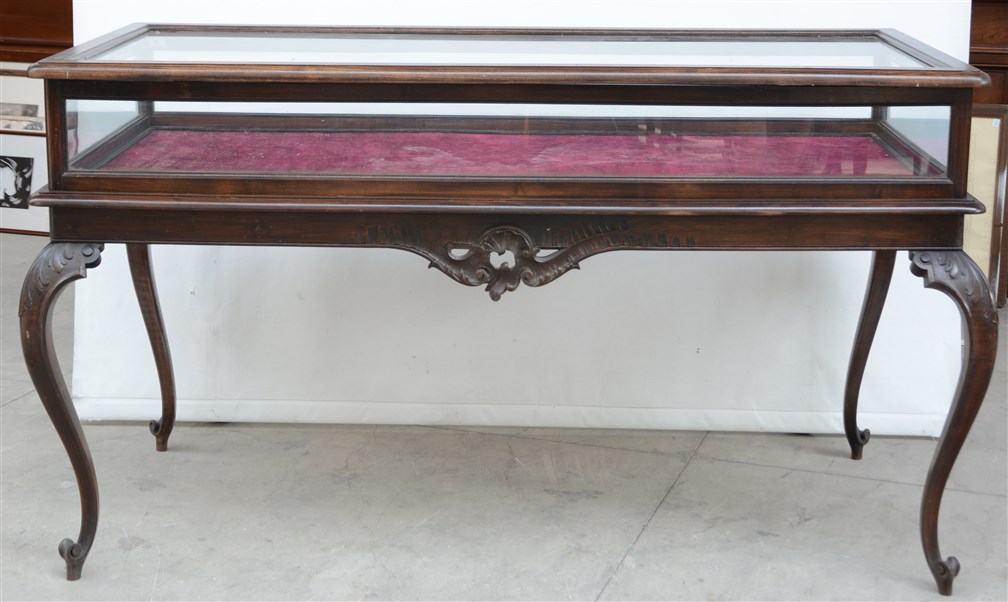 Tavolo/vetrina da centro in legno con fascia e gambe sagomate e intagliate a motivi vegetali (cm 166x94x68) (difetti)