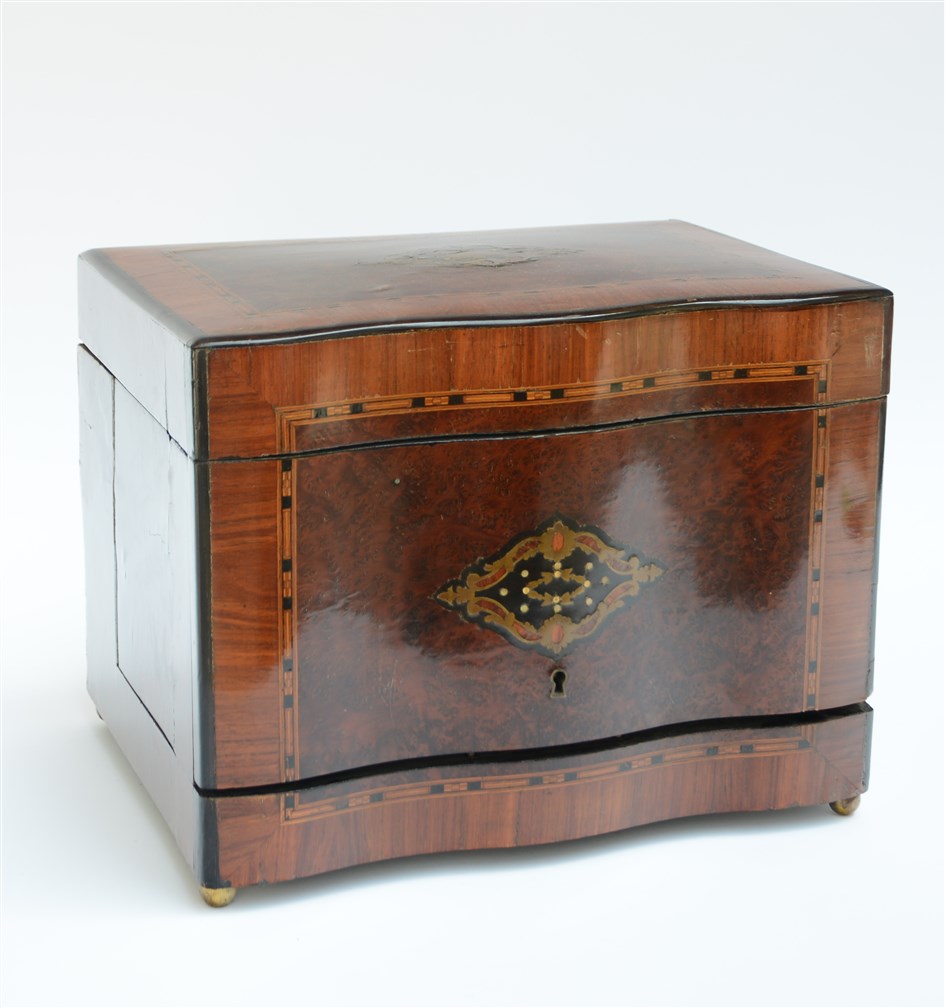 Cofanetto lastronato e filettato in legni vari con medaglione in ottone. Secolo XIX (cm 34x27x24) (difetti e mancanze)