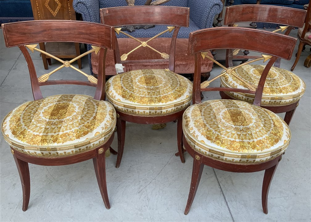 Gruppo di quattro sedie in legno laccato rosso e oro, schienale curvo decorato da frecce incrociate, gambe a sciabola, secolo XX (difetti e restauri)