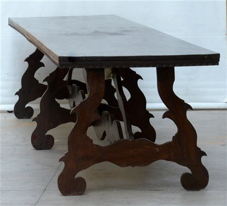 Grande tavolo in stile fratino in legno dolce, gambe e traverse sagomate (cm 390x79x84) (difetti)