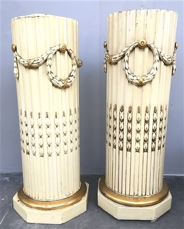 Coppia di colonne scanalate in legno laccato, parzialmente dorato, decorate con festoni e fiori stilizzati (h cm 93, d cm 38) (difetti)