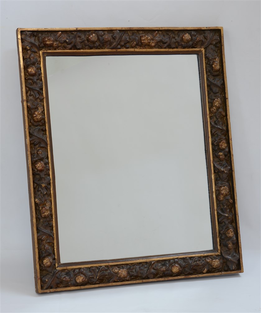 Specchiera con cornice in legno e decori in papier-mâché modellati a forma di foglie e frutti in rilievo (cm 79x94) (difetti)