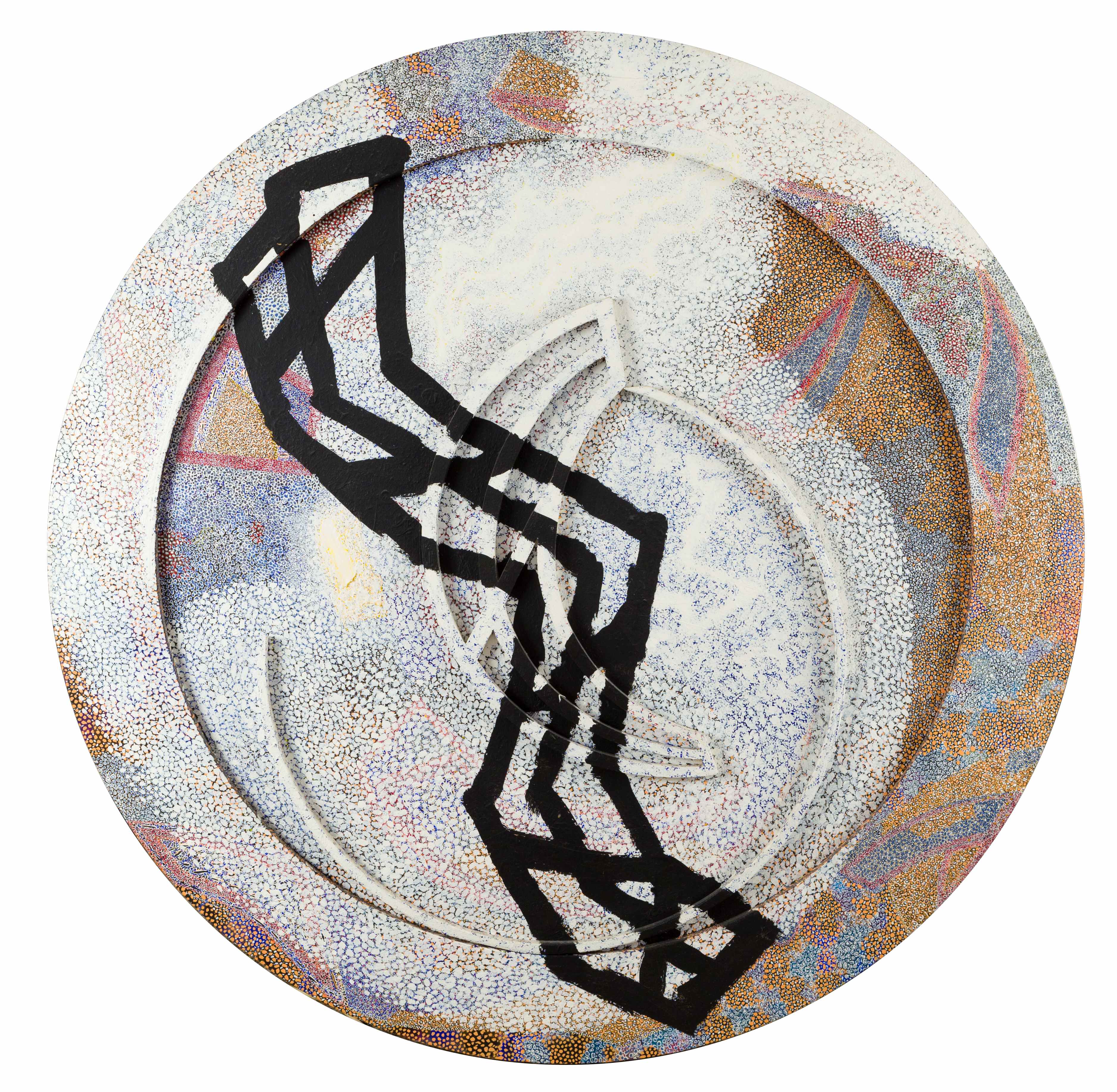 PLINIO MESCIULAM Luna corrusca olio su tavola e legno sagomato, diametro cm 160 firmato e titolato sul retro scritte dell'autore sul retro