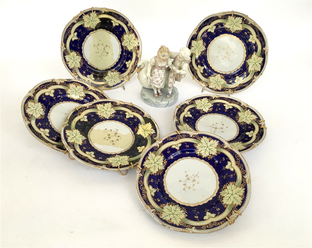 Lotto composto da sei piatti decorativi a motivi floreali e un gruppo in porcellana raffigurante fanciulli pattinatori con cigno (gravi difetti e restauri)