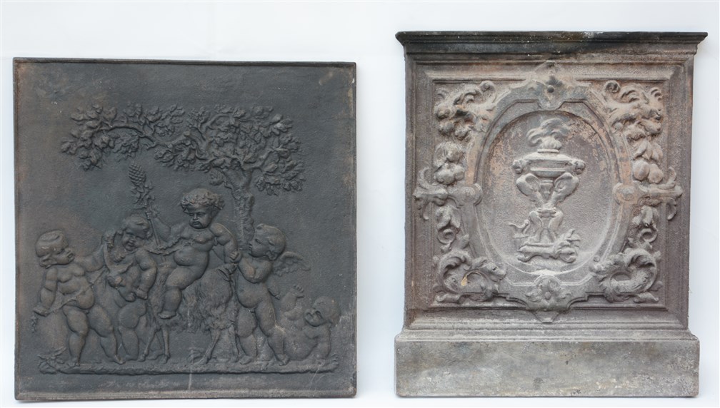 Lotto 1950 | Lotto di due piastre da camino in ghisa, una decorata con giochi di putti e l'a