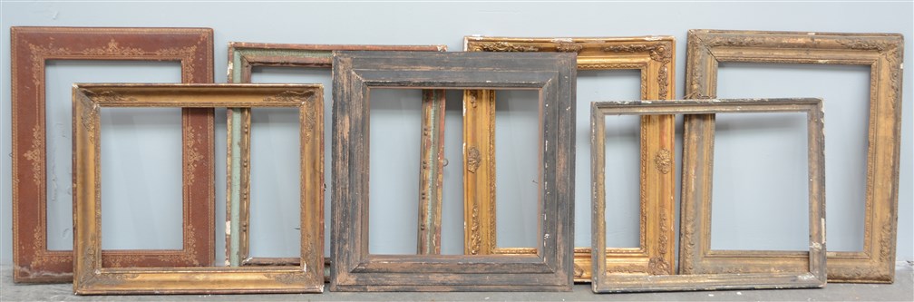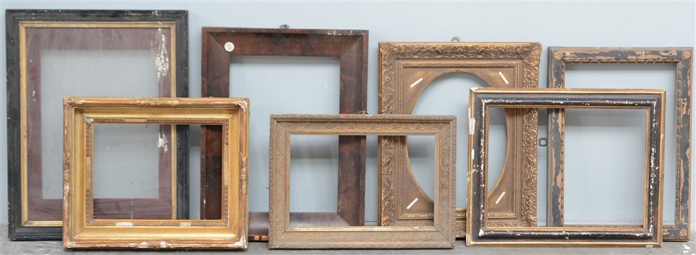 Lotto di quattordici cornici in legno e pastiglia dorata di epoche, dimensioni,