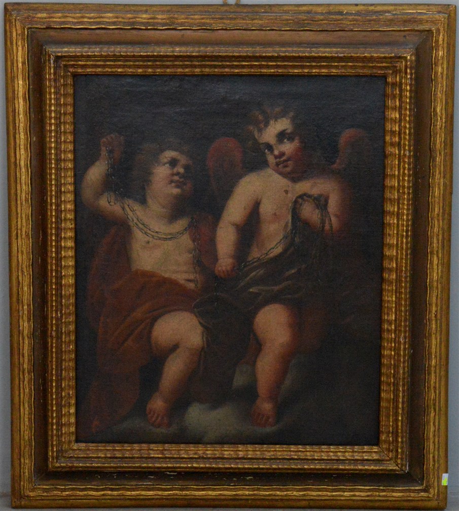 Lotto 1964 | Scuola della fine del secolo XVII, "Angeli con catene" olio su tela (cm 67x56)