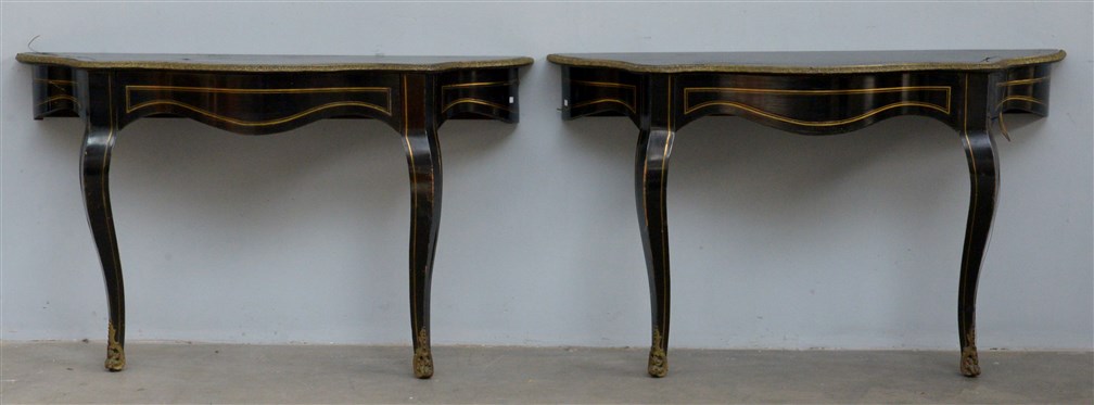 Coppia di tavoli da parete di forma mossa in legno ebanizzato e filettato in ottone (cm 128x78x40) (difetti)
