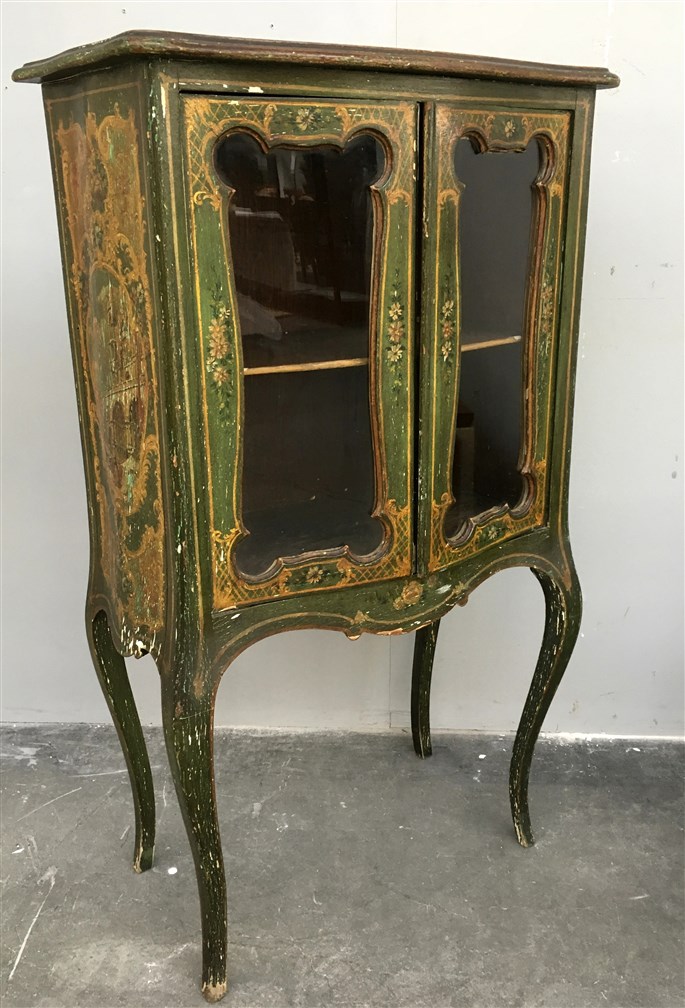 Vetrinetta a due sportelli laccata verde con profili mossi, dipinta con fiori e paesaggi (cm 59x104x34) (difetti)