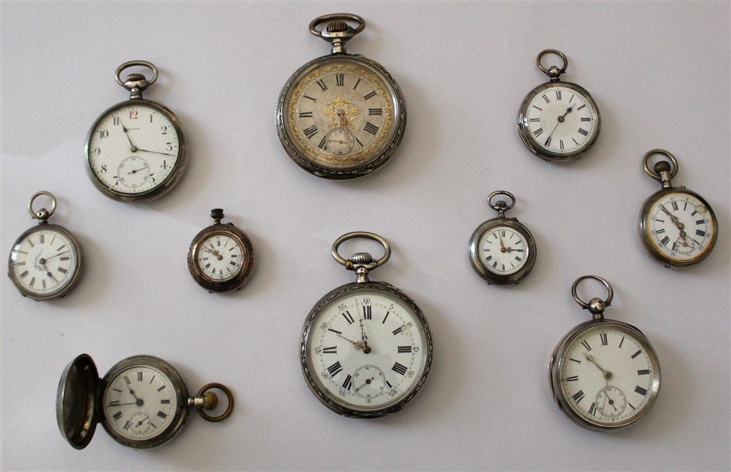Lotto composto da dieci orologi da tasca in argento e metallo, di diverse dimensioni, epoche e fatture