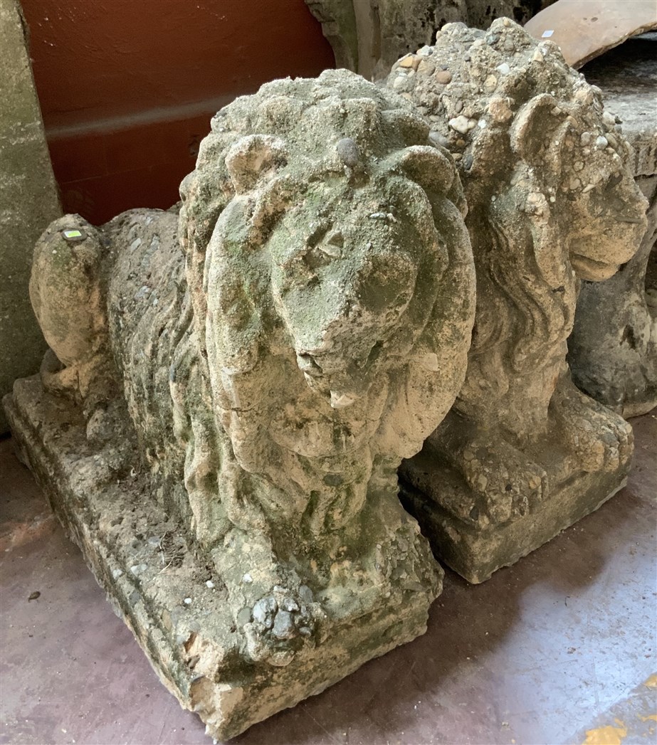 Coppia di sculture da giardino raffiguranti leoni accovacciati (cm 60x60x30) (difetti)