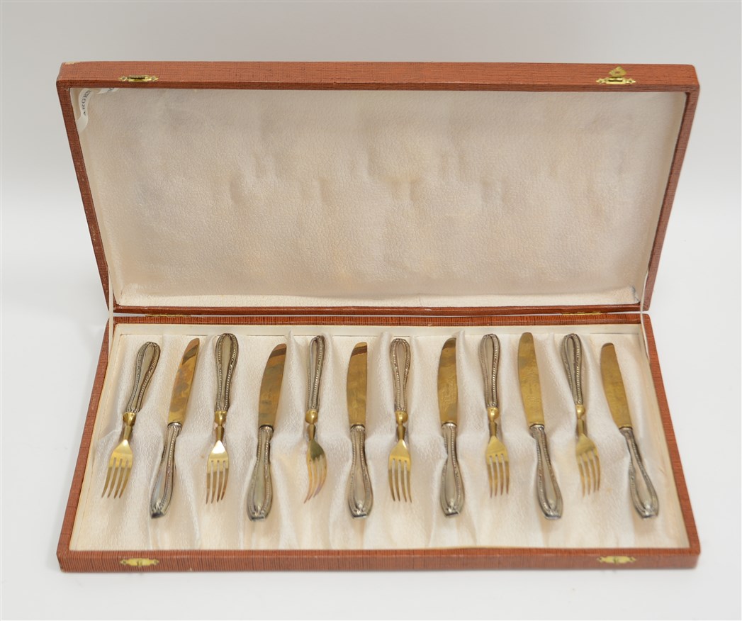 Servizio da dessert composto da sei coltellini e sei forchettine rivestite in lamina d'argento, in custodia originale (difetti)