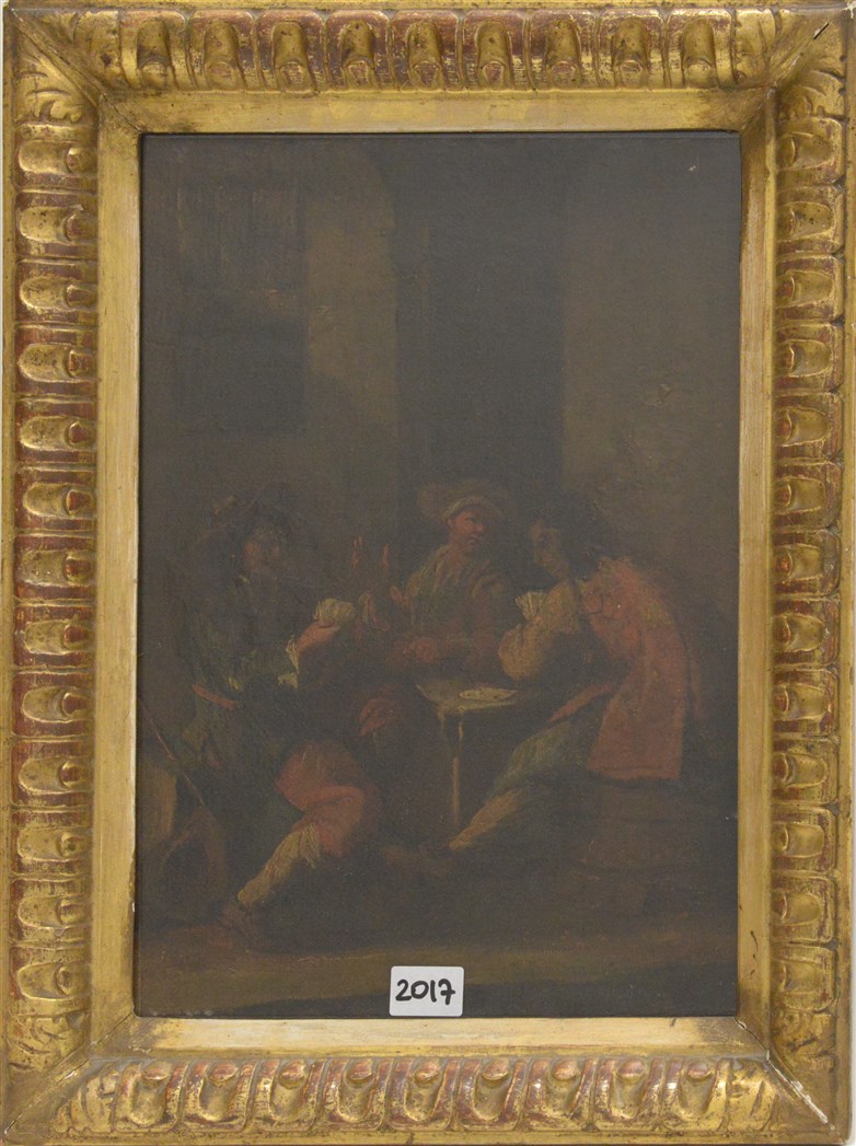 Scuola fiamminga del Secolo XIX, "Giocatori di carte", olio su tela (cm 32,5x25), in cornice (difetti e restauri)