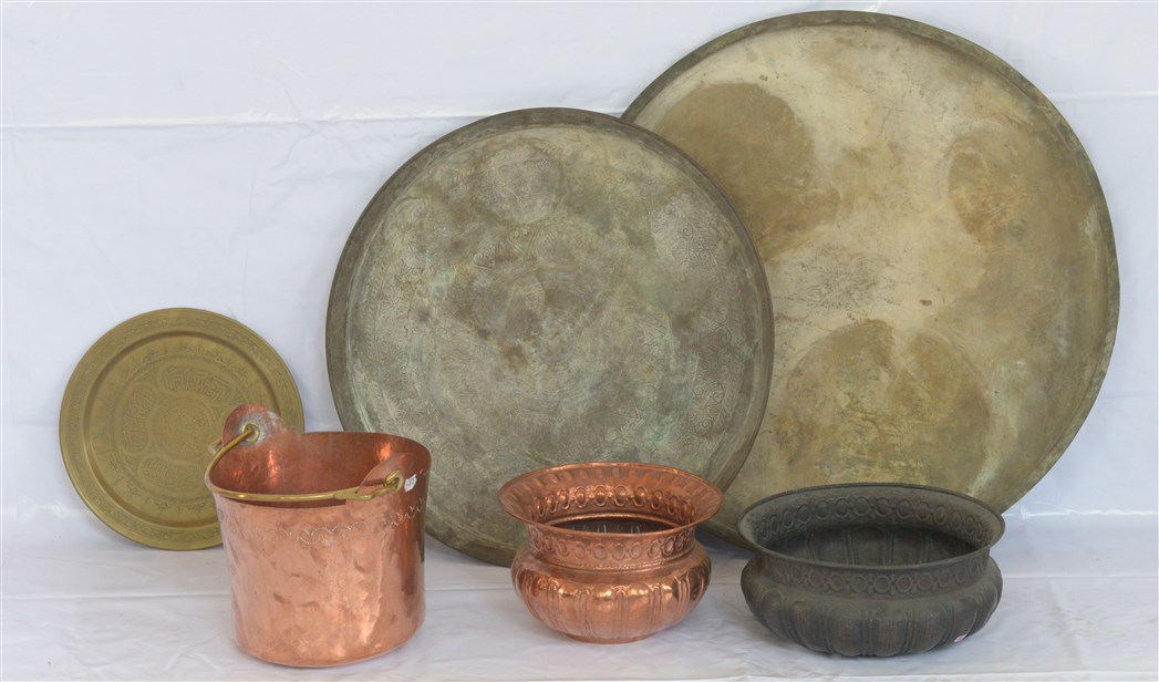 Lotto composto da tre piatti piani, due cache pot ed una casseruola in rame alt