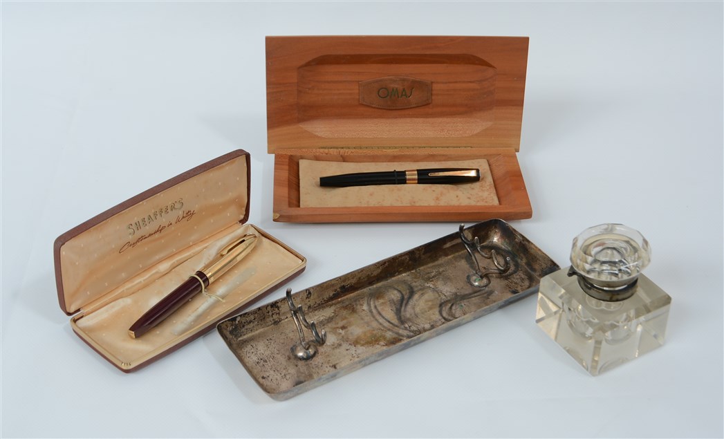 Lotto composto da due stilografiche in astuccio, un calamaio ed una vaschetta p