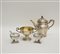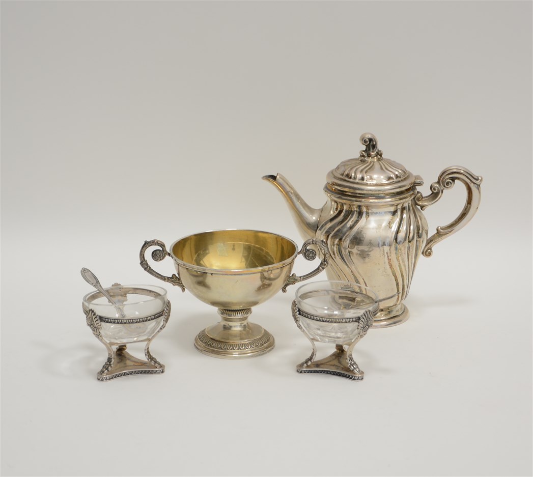Lotto composto da due salierine, una zuccheriera ed una caffettiera in argento (g 380 ca.) (difetti)