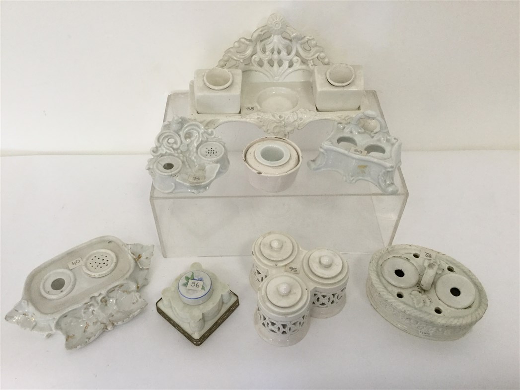 Gruppo di otto calamai in ceramica bianca di fatture differenti (difetti e manc