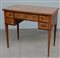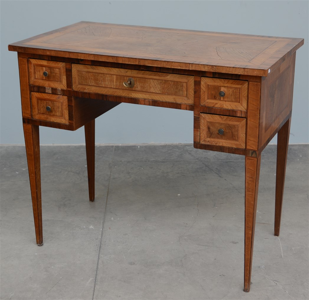 Scrittoio lastronato in noce e radica di noce filettato, cinque cassetti, gambe