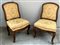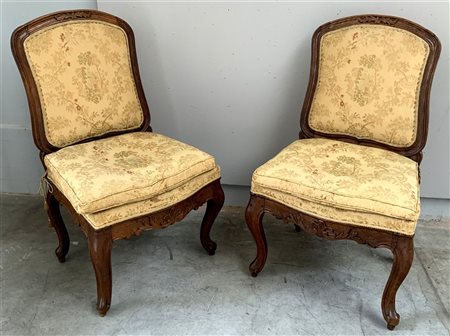 Coppia di sedie Luigi XV in noce con cuscini e spalliere in tessuto operato a m