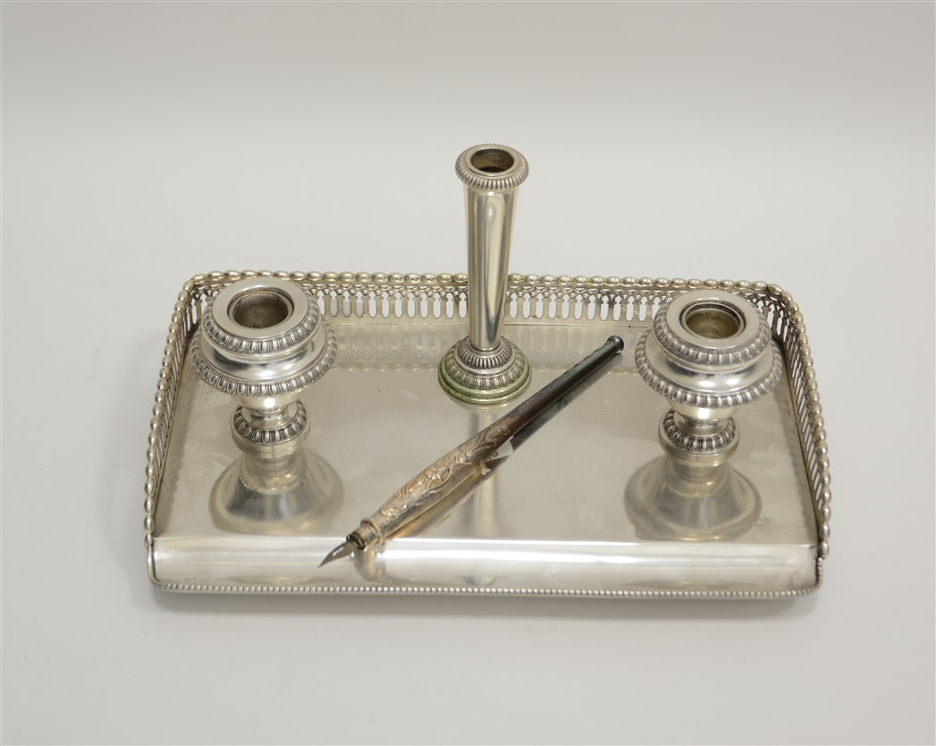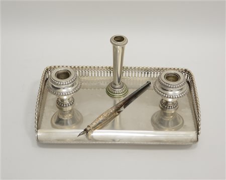 lotto composto da un calamaio a vassoio in argento con ringhierina, contenitori