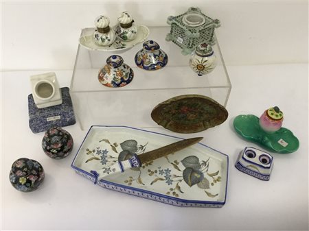 Lotto composto da otto calamai, due vassoi, un tagliacarte e due vasetti cinesi con coperchi, fatture e materiali differenti (difetti e mancanze)