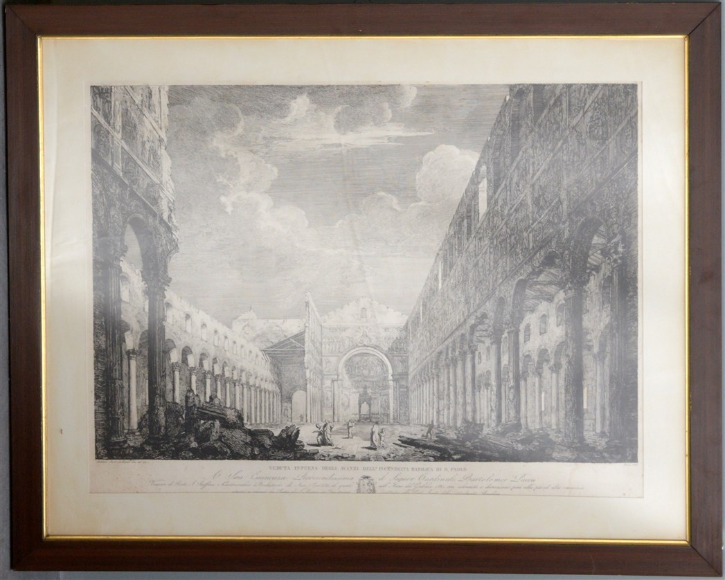 Antonio Sarti "Veduta interna degli avanzi dell'incendiata Basilica di San Paolo" acquaforte (mm 460x670) Datata Roma 1827 in lastra. In cornice