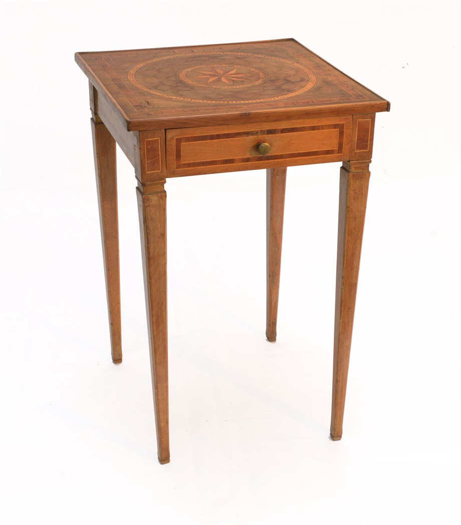 Tavolino da salotto a un cassetto con piano filettato ed intarsiato a stella ed elementi concatenati, gambe rastremate. Secolo XIX (cm 47x72x48) (difetti)