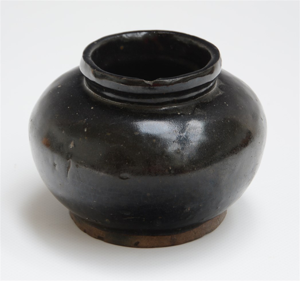 Piccolo in ceramica a spessa invetriatura bruna. Manifattura cinese (h cm 9) (difetti)