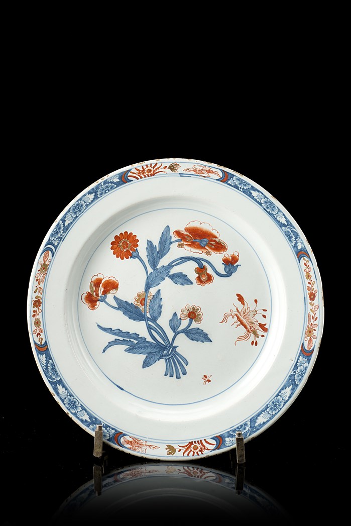 Manifattura di Felice Clerici o Pasquale Rubati, Milano, 1760 circa. Piatto tondo in maiolica con bordo liscio decorato con nastro a risparmio in blu con fiori e quattro riserve in rosso ferro. Al centro mazzo di fiori con peonie ed una grossa farfalla in tricromia Imari rosso, azzurro, oro. Lo smalto si presenta azzurrato (d. cm 23) (sbeccature)