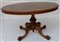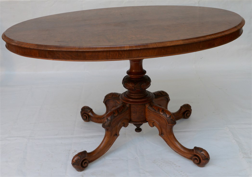 Tavolo da centro con piano ovale radicato, gambe centrale a balaustro con quattro piedi intagliati e sagomati (cm 138x80x100) (difetti)