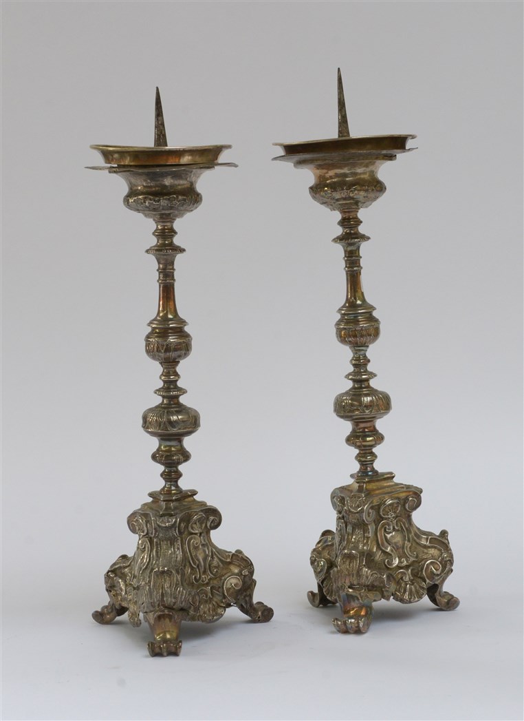Coppia di portaceri in metallo argentato e sbalzato a volute e foglie. Secolo XVIII (h. cm 37) (difetti)